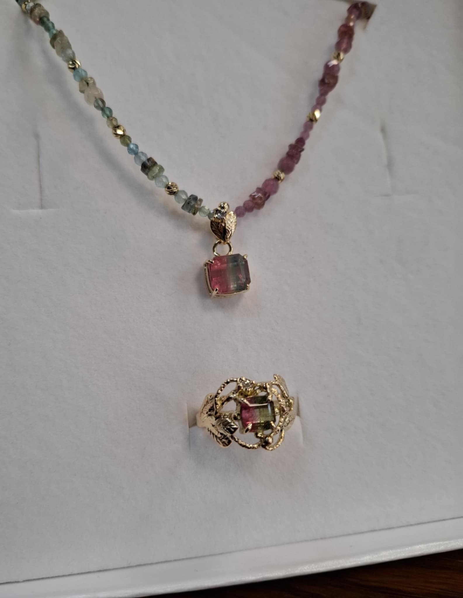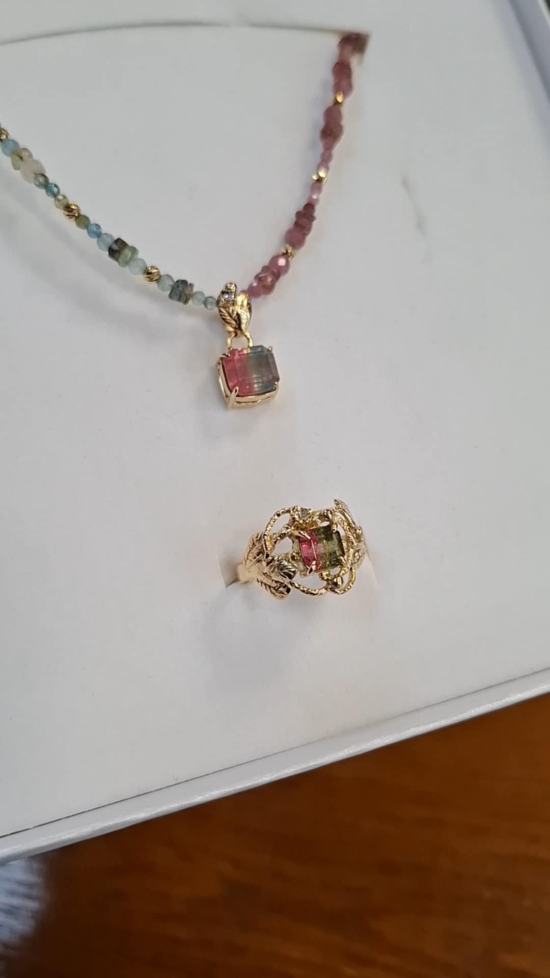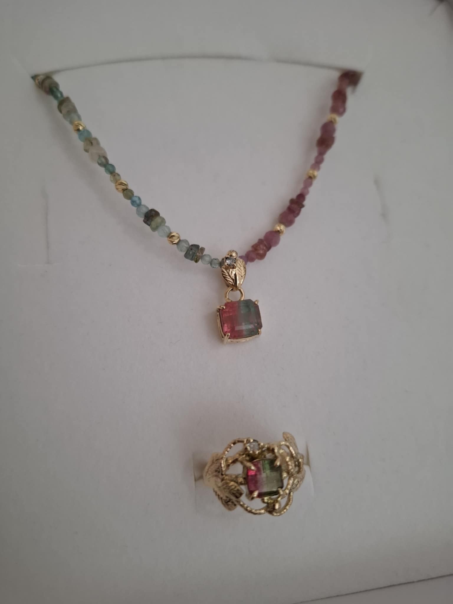 Златен пръстен с турмалин диня, медальон с турмалин диня G698