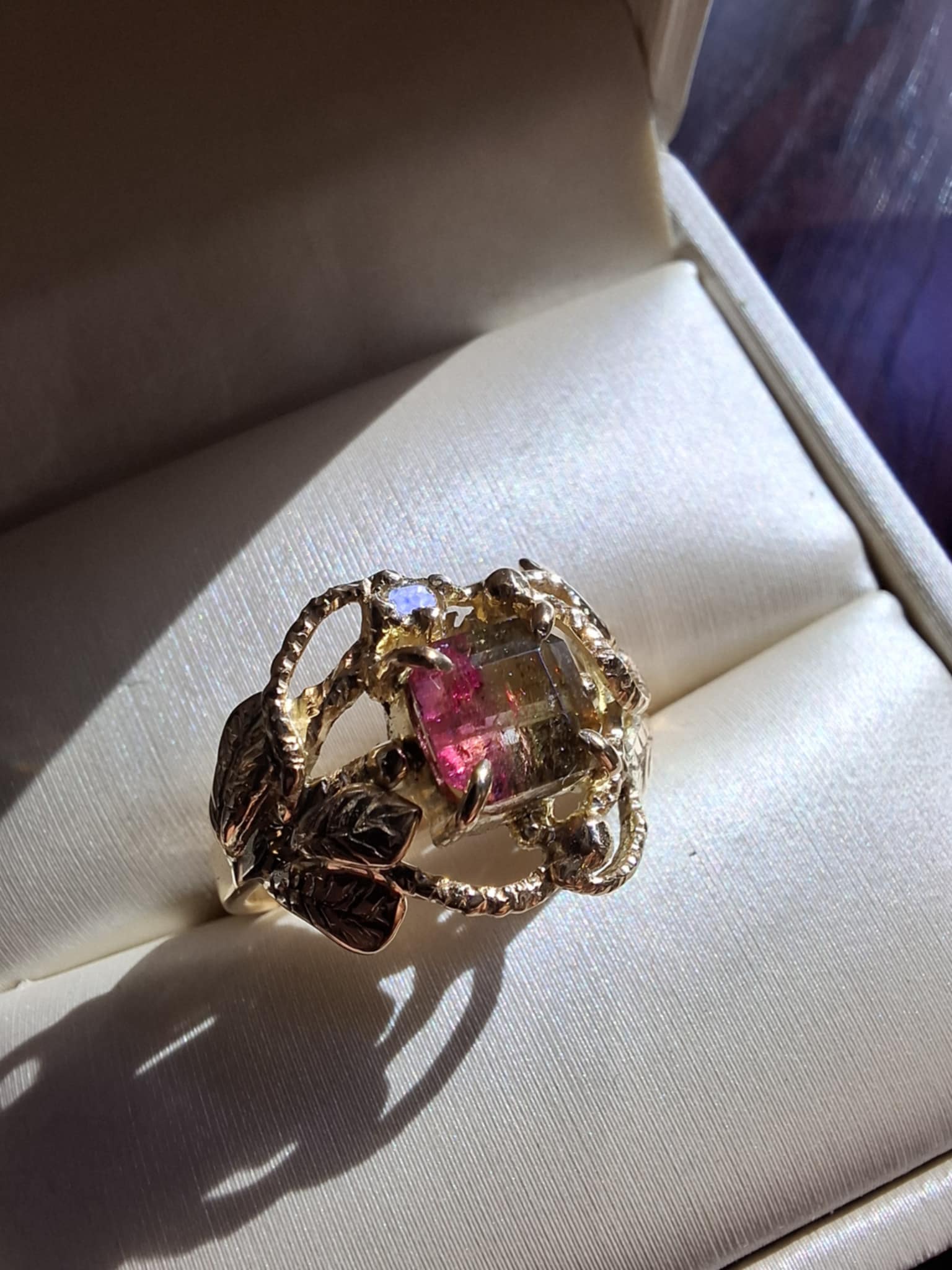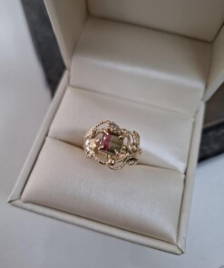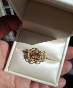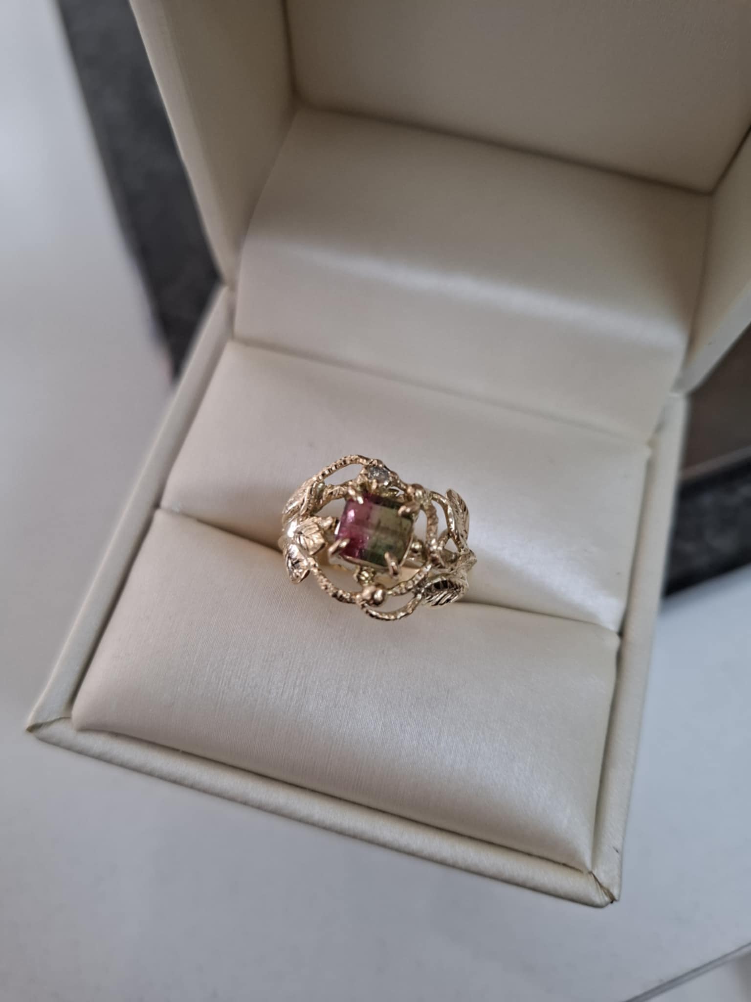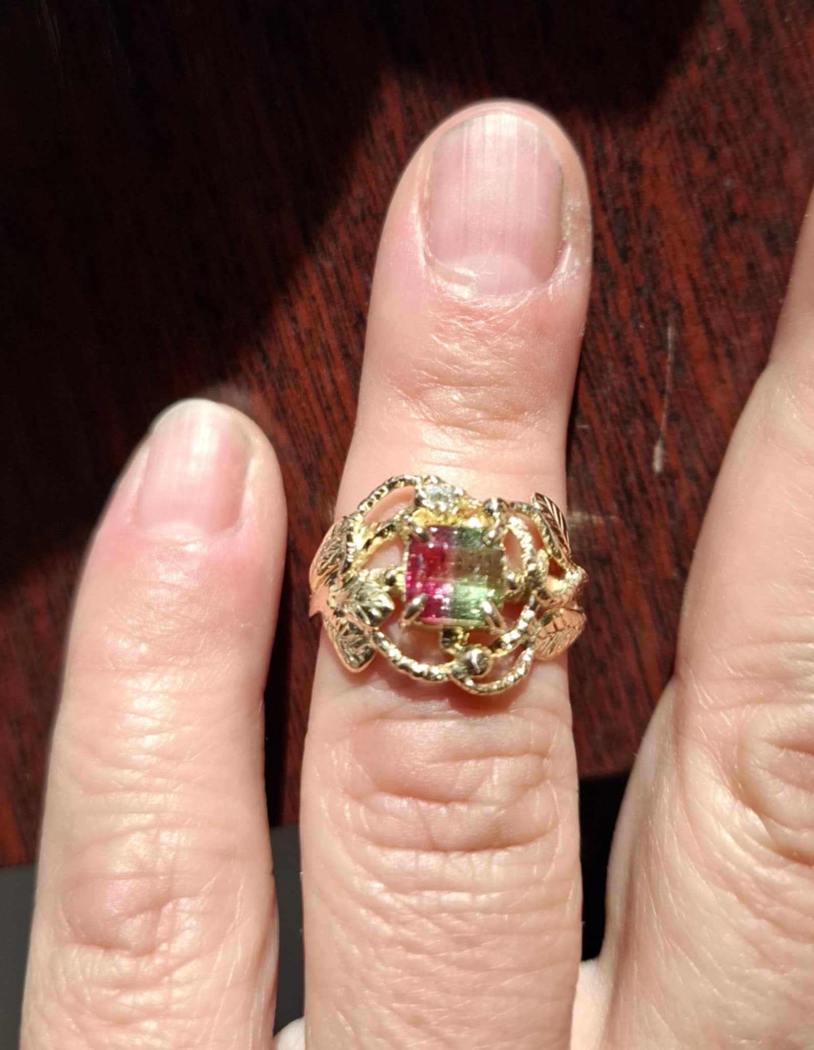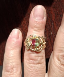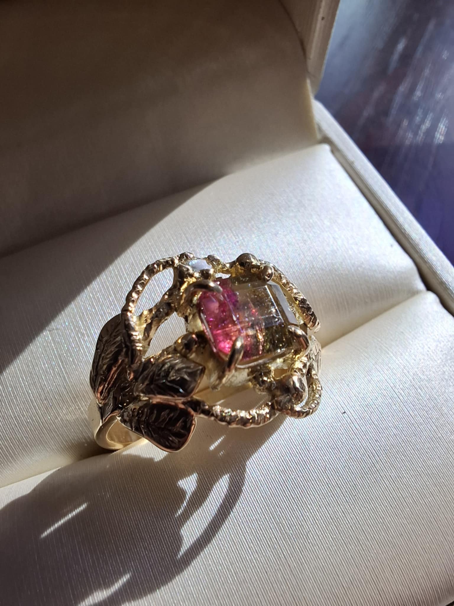 Златен пръстен с турмалин диня, ръчна изработка, уникат.