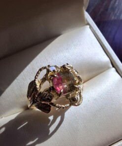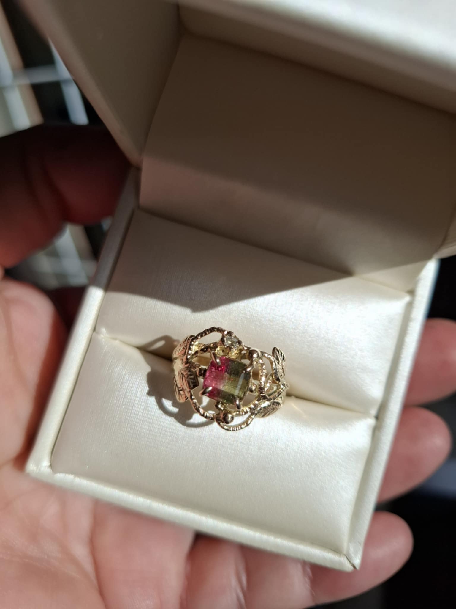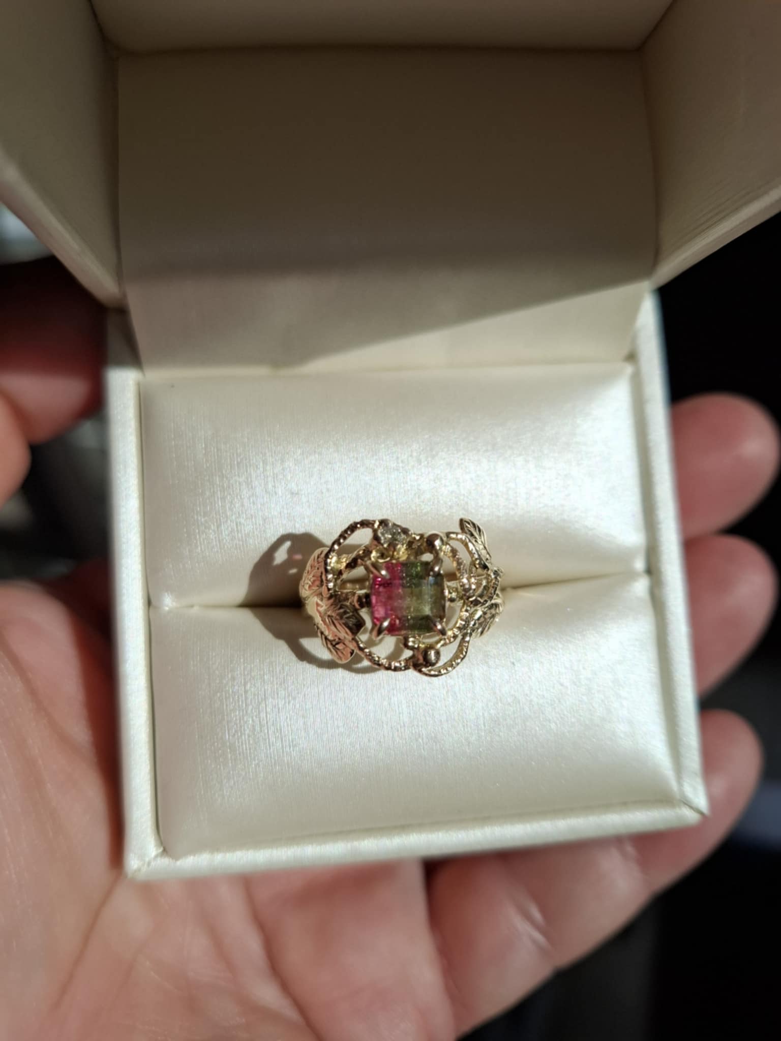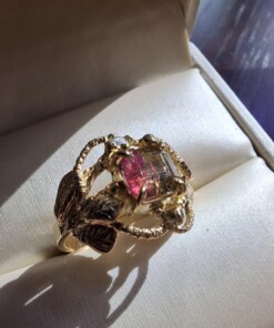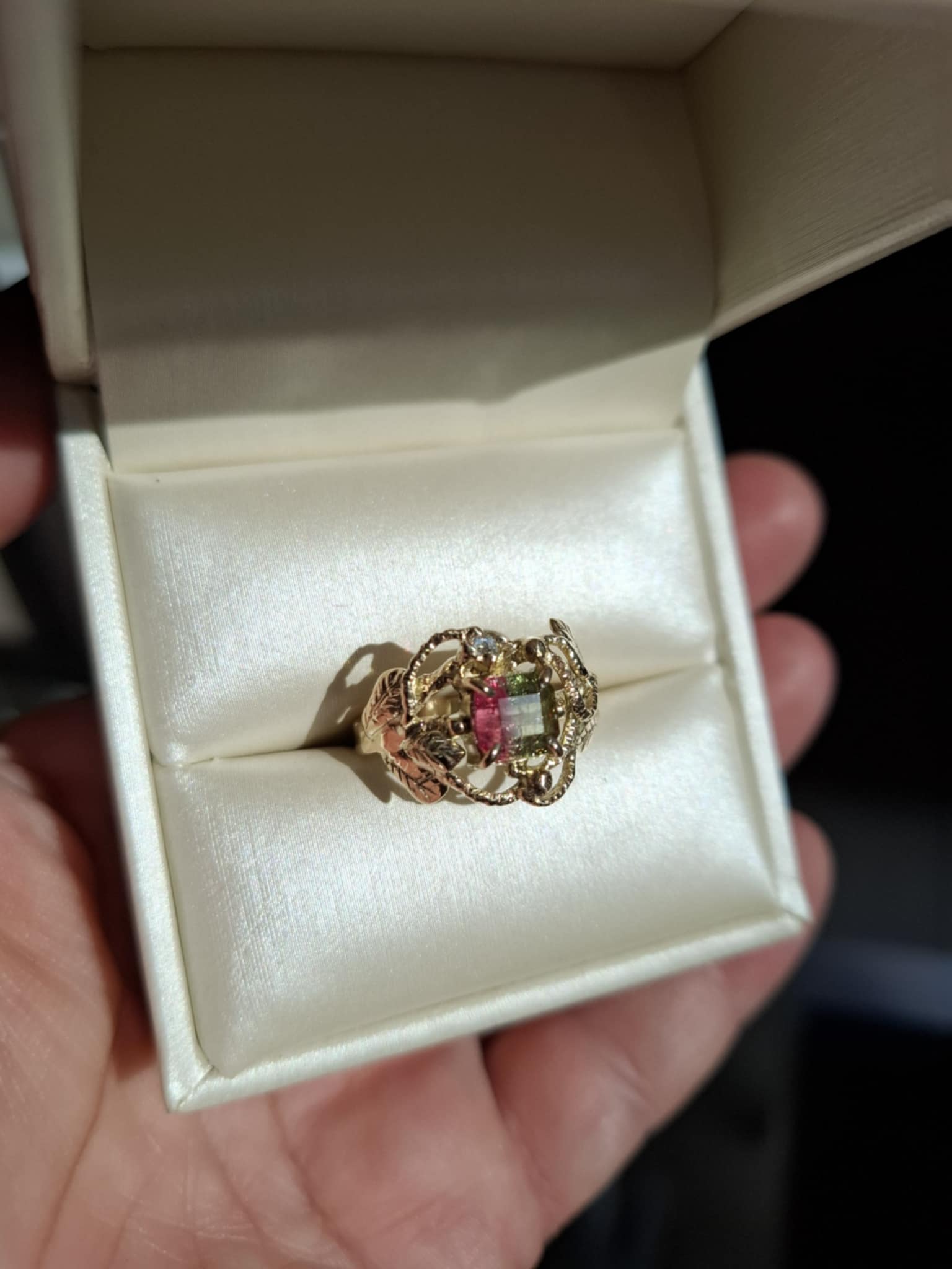 Златен пръстен с турмалин диня, ръчна изработка, уникат.