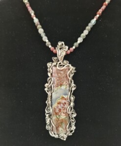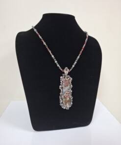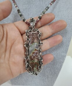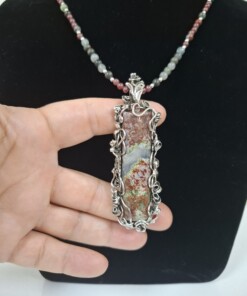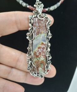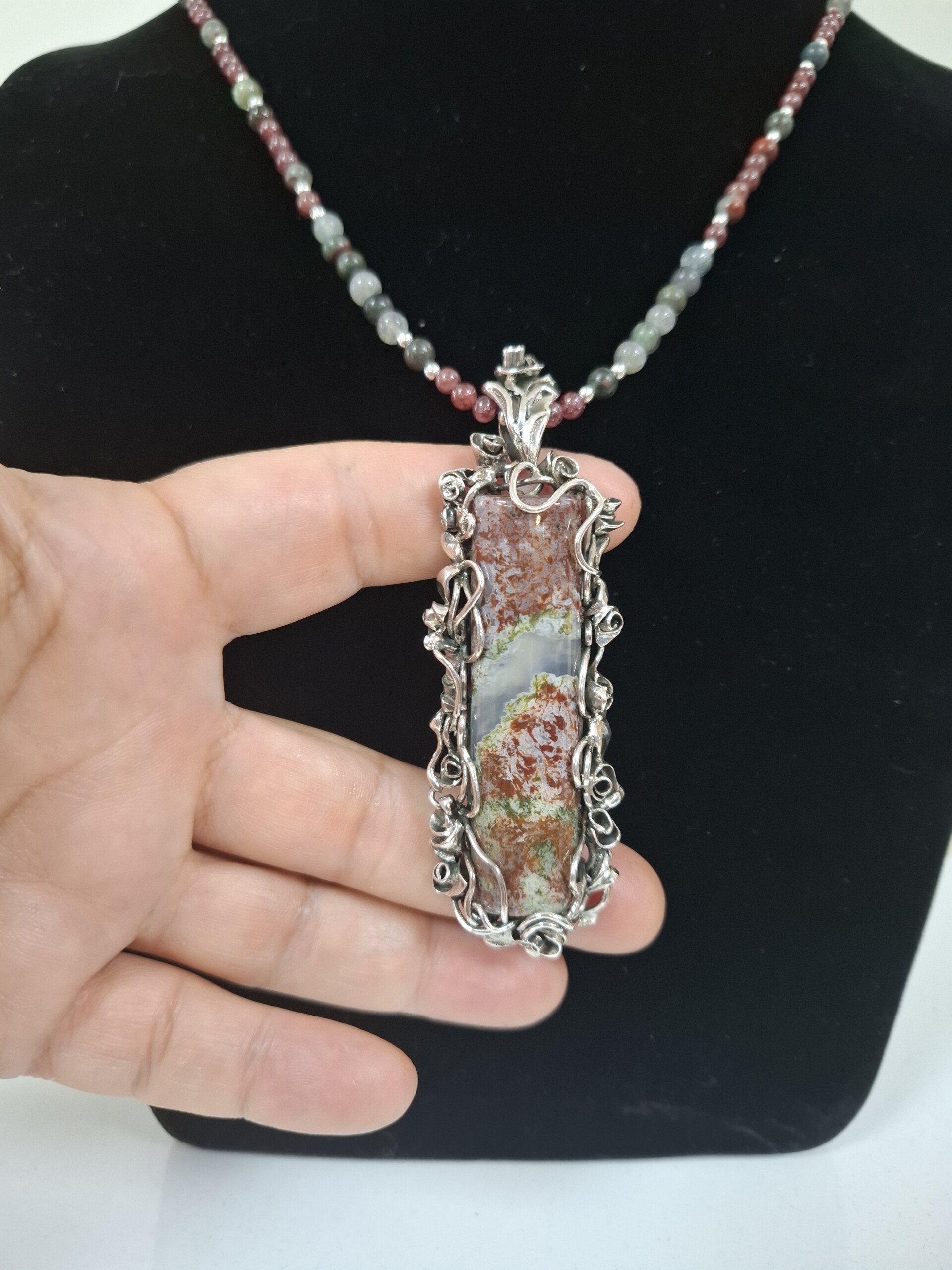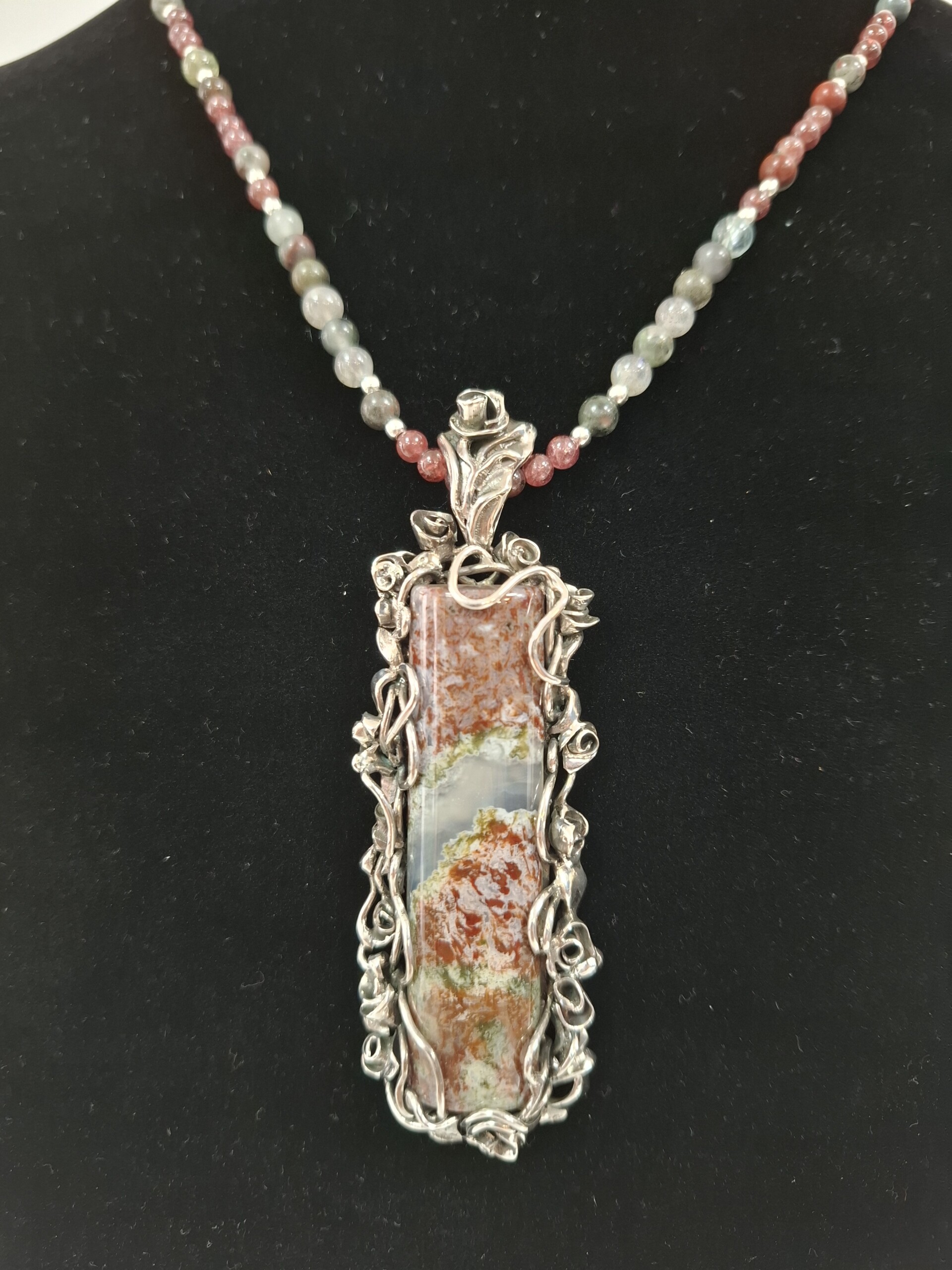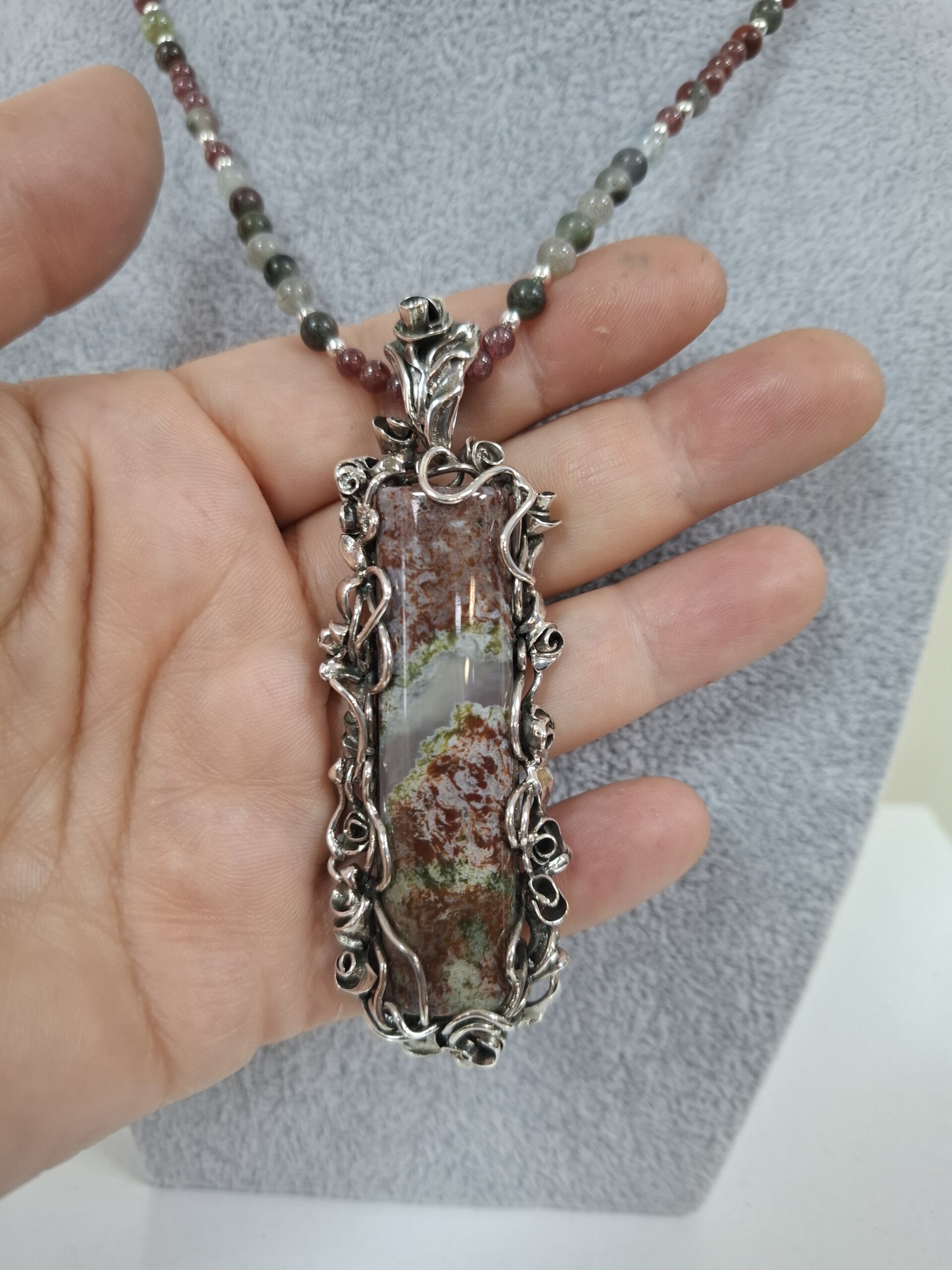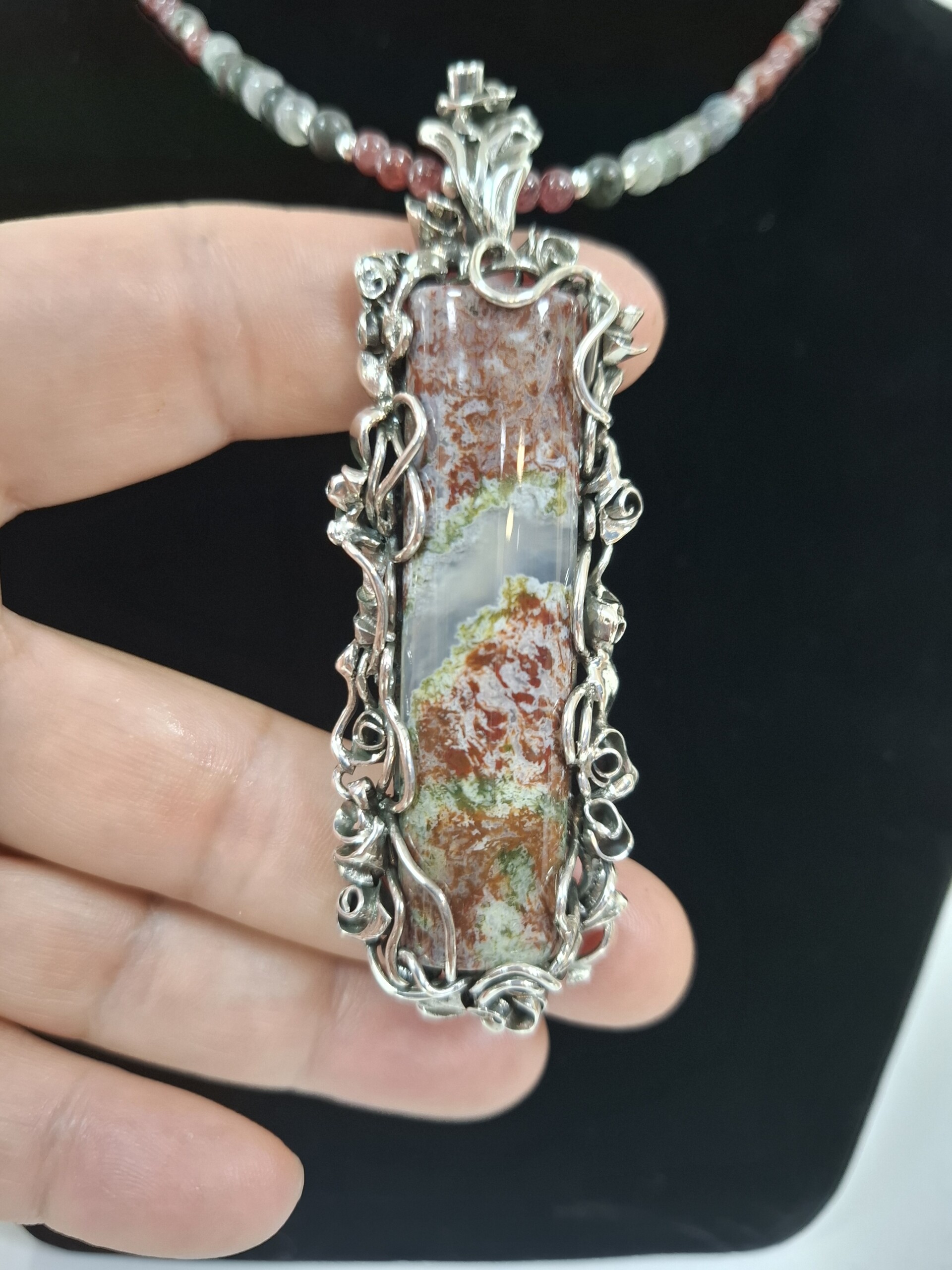 Комплект „Вълшебна роза“ – колие, пръстен и обеци, със специално подбран мъхов ахат от България в рядко съчетание на цветове – червено и зелено.