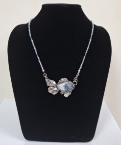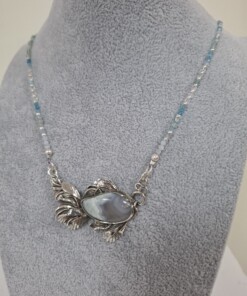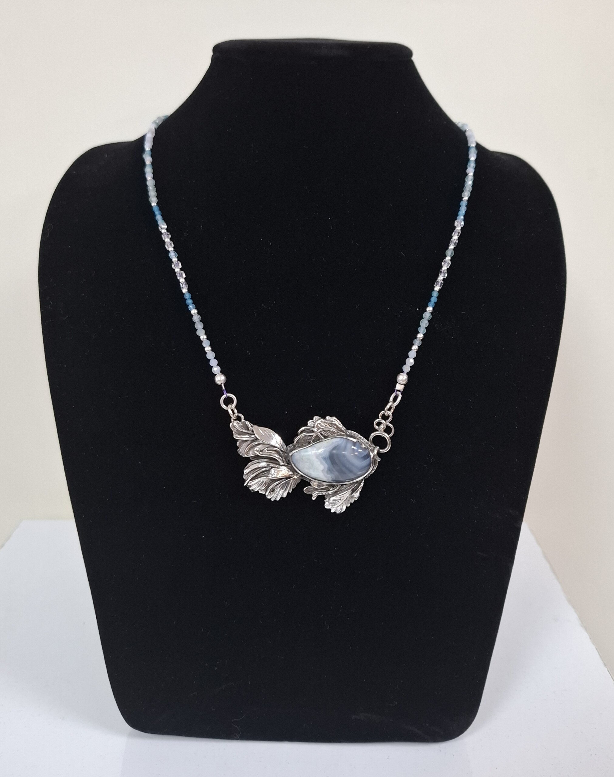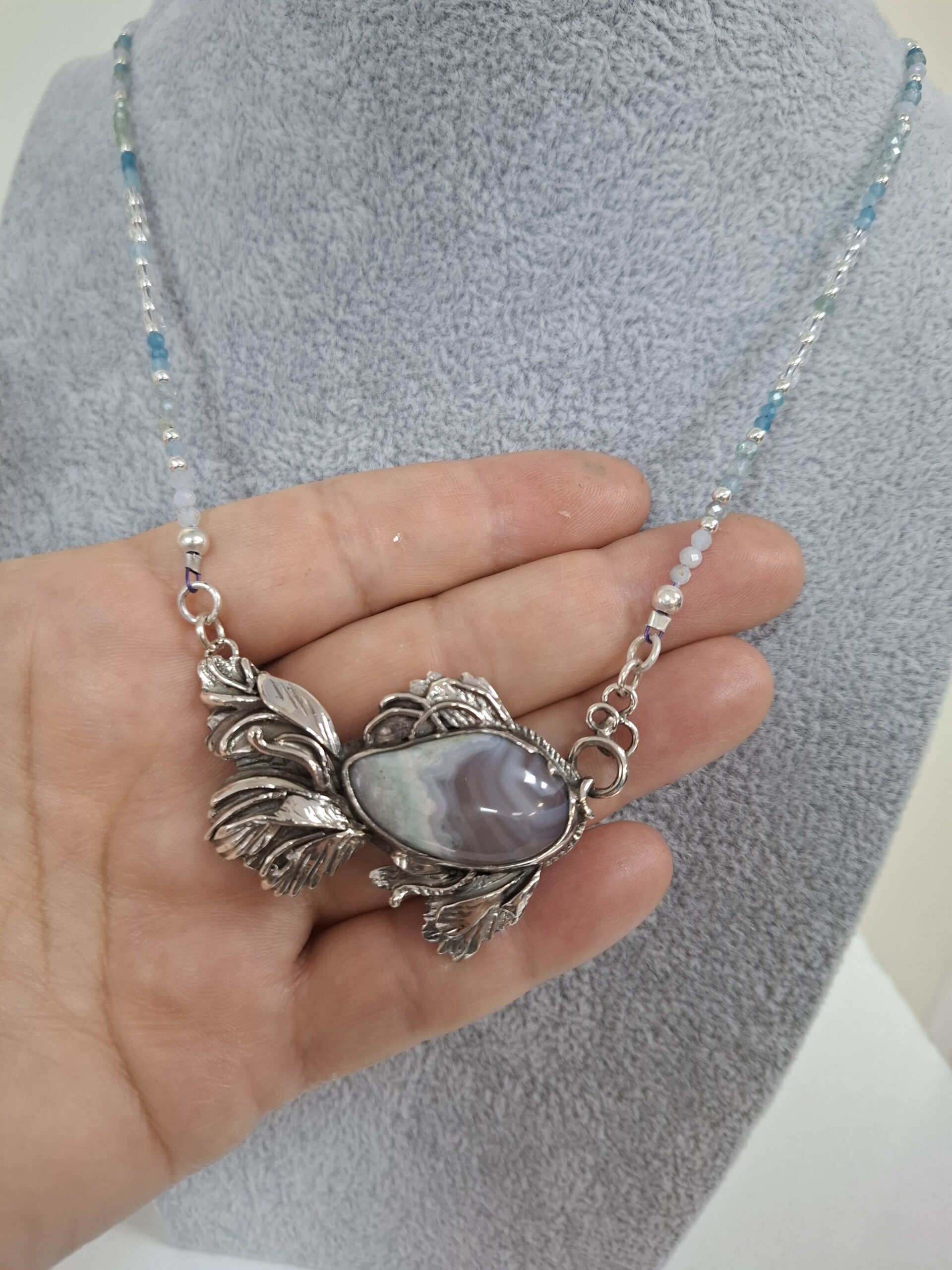 Колие „Морско цвете“, изработено от сребро, ахат от България и огърлица от аквамарини, планински кристал, апатити и сребърни елементи.