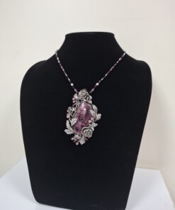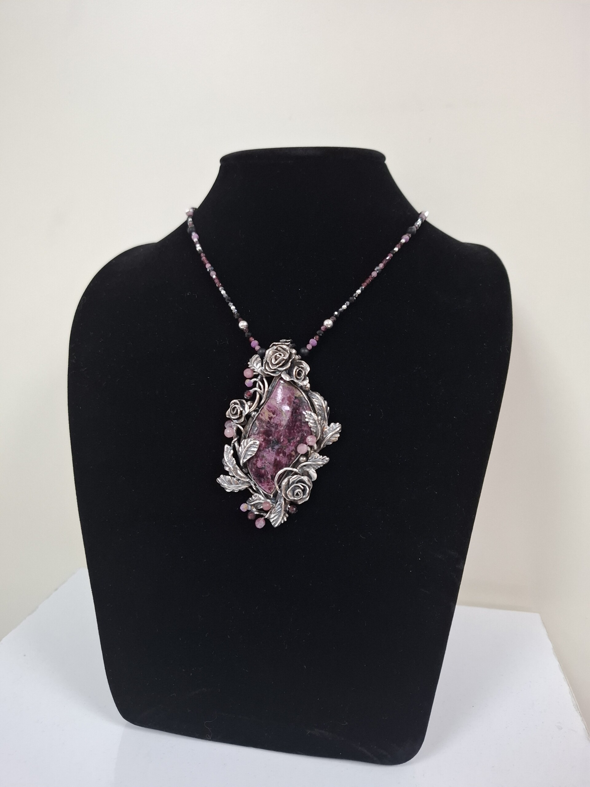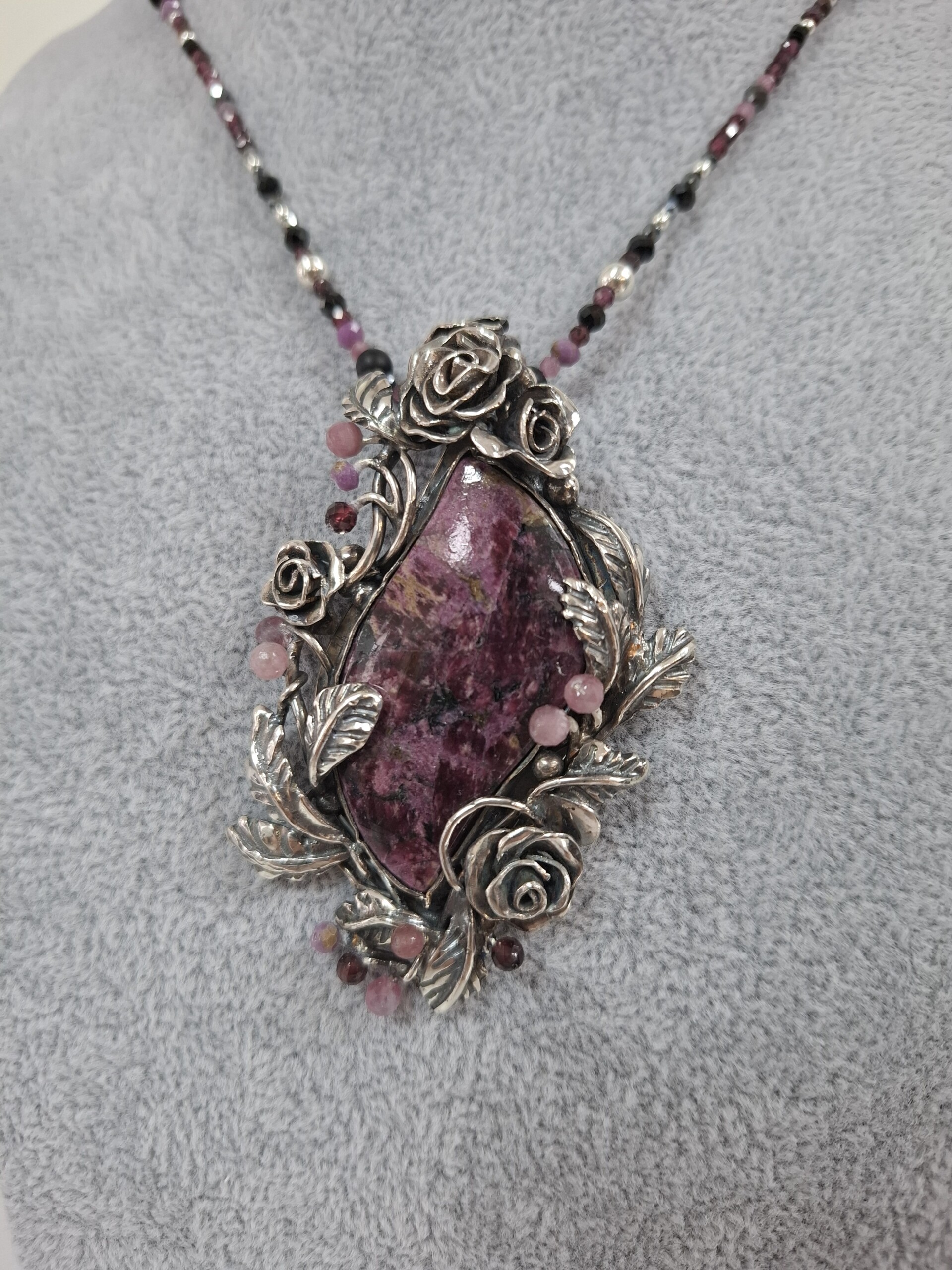 Разкошен медальон с флорални мотиви, камък Евдиалит от Колския полуостров, Русия, мъниста от турмалини и рубини, сребро, патина.